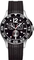 Hamilton H64512332 the 6 o'clock, chronograph minutes subdial at the 10 o'clock and 1/10th of a second subdial at the 2 o'clock, Date at the 4 o'clock position, Black rubber strap, Pin buckle, Sapphire crystal, Push/pull crown, Swiss quartz chronograph movement, Water resistance to 10 ATM/100 meters/330 feet, Case measurements are 42 mm in diameter x 15 mm thick, Strap measurements are 21 mm wide x 8 inches long. Hamilton is established as one of the leading watchmakers in the world with a proven reputation for creating elegant and reliable timepieces Black dial Pin buckle ...